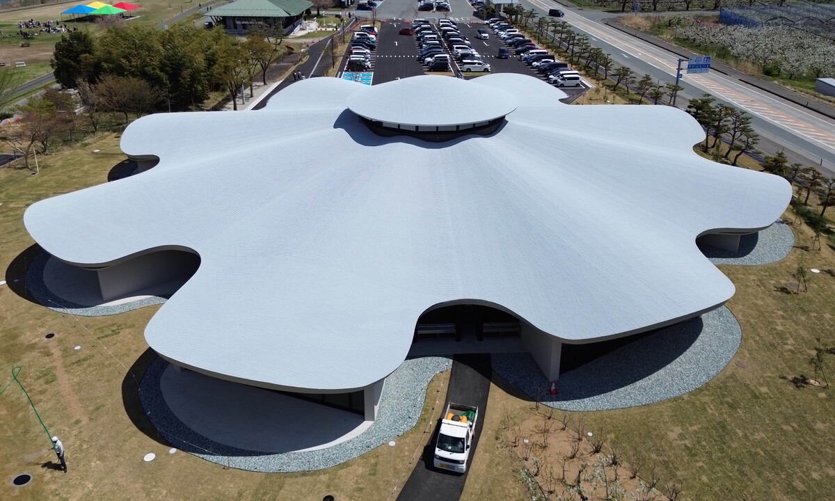 同建物は地域の特産品であるさくらんぼの花びらをモチーフとした有機的に波打つ屋根が特徴であり、現代の高度な3次元技術だからこそ可能となる鉄骨造と、木造の複合シェルによる大空間を持つ建物である。